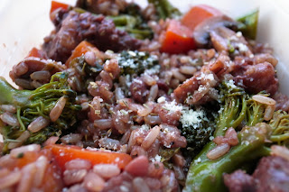 由於好一陣子沒有認真煮飯,仔細思索後,決定煮兩種菜色一中一西,「紅酒義大利燉飯」食譜出自《把托斯卡尼帶回家》的巴羅洛紅酒義大利燉飯,但其實從來沒做過義式燉飯,有些材料也懶得去找,像牛肉高湯、牛骨一律用牛肉代替,紅酒是從7-11買來的「塔利諾」,雖然也義大利紅酒,但實際烹煮後,酒澀味有點重。米沒有煮熟透,米芯稍硬,牛肉又煮太老了,所以有點小失敗。而另一道「台式牛肉炒飯」從《中國米食》的「牛肉糙米飯」變化而來,書上做法是將配料和米一起用壓力鍋煮熟,不過家裡沒有壓力鍋,所以改用炒飯的做法,另外加了玉米粒和高麗菜,先用滾水將紅蘿蔔和牛肉燙2分鐘,不必過熟,再放入熱油鍋快炒,倒入冷飯,加一點醃料的醬汁,撒蔥花。米飯煮得微溼黏潤,牛肉軟硬適中,雖然和一般大火快炒,粒粒分明,帶著醬油焦香味的炒飯不一樣,但這道菜煮得滋味也相當不錯。